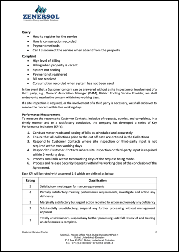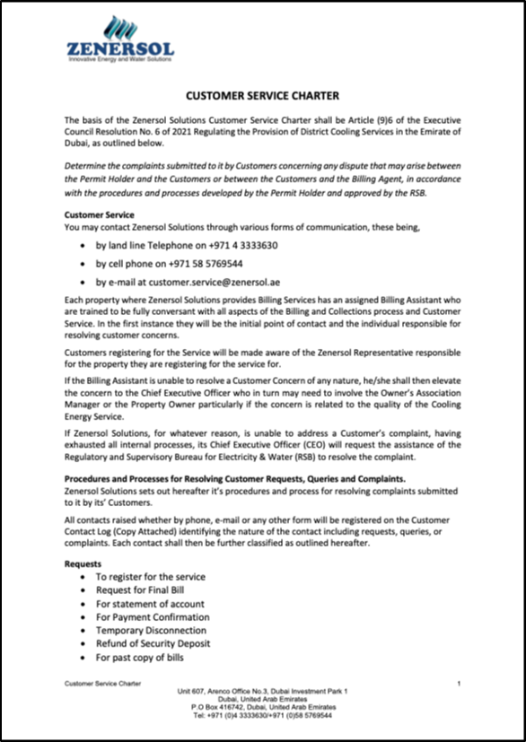 Zenersol Solutions Customer Service Charter is based in Article 9 of the Executive Council Resolution No. 6 of 2021 regulating the provision of District Cooling Services in the Emirate of Dubai.